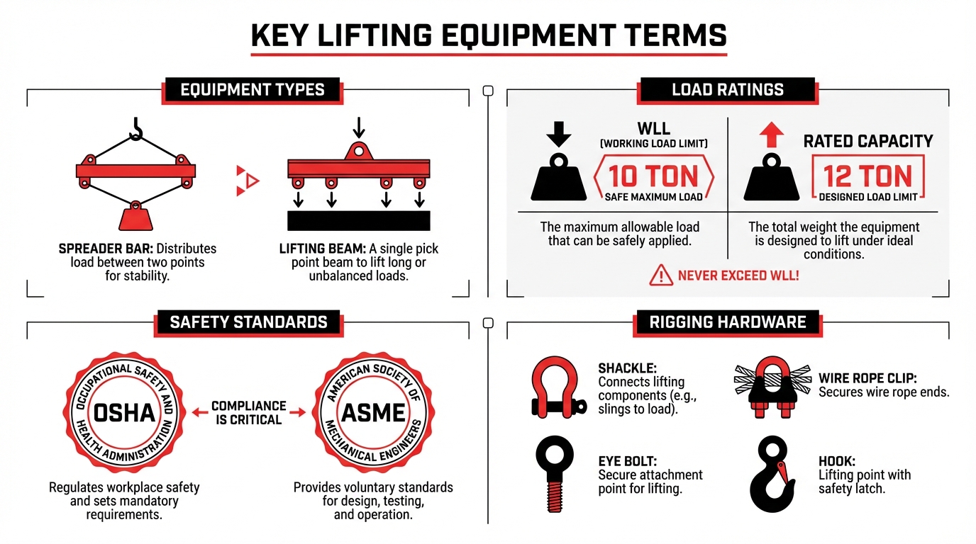 Key terms in spreader bar and lifting beam rental are the technical definitions, load ratings, regulatory standards, and rigging concepts that govern how below-the-hook lifting devices are specified, inspected, and operated. Knowing these terms is essential for safe equipment selection and full regulatory compliance on any crane lift project.