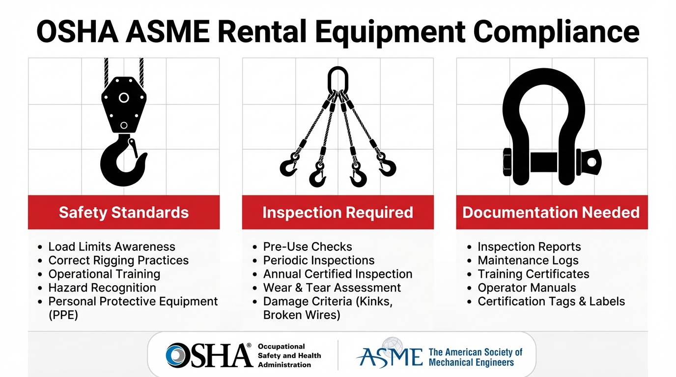 OSHA and ASME considerations for rental equipment are the regulatory and engineering standards that govern safe use, inspection, and maintenance of lifting gear regardless of ownership status. OSHA’s General Duty Clause and specific standards like 1926 Subpart CC apply to rented cranes, slings, and hoists exactly as they apply to owned equipment, while the ASME B30 series sets removal-from-service thresholds and rated load requirements for every rigging component in a rental fleet.